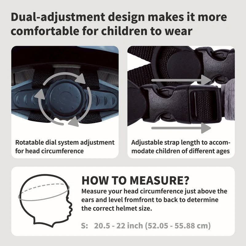 ขนาดปรับได้: 20.5-22 นิ้ว (52.05-55.88 ซม.) สายปรับความยาวได้เพื่อรองรับเด็กทุกวัย อายุปรับได้: 5-13 ปี