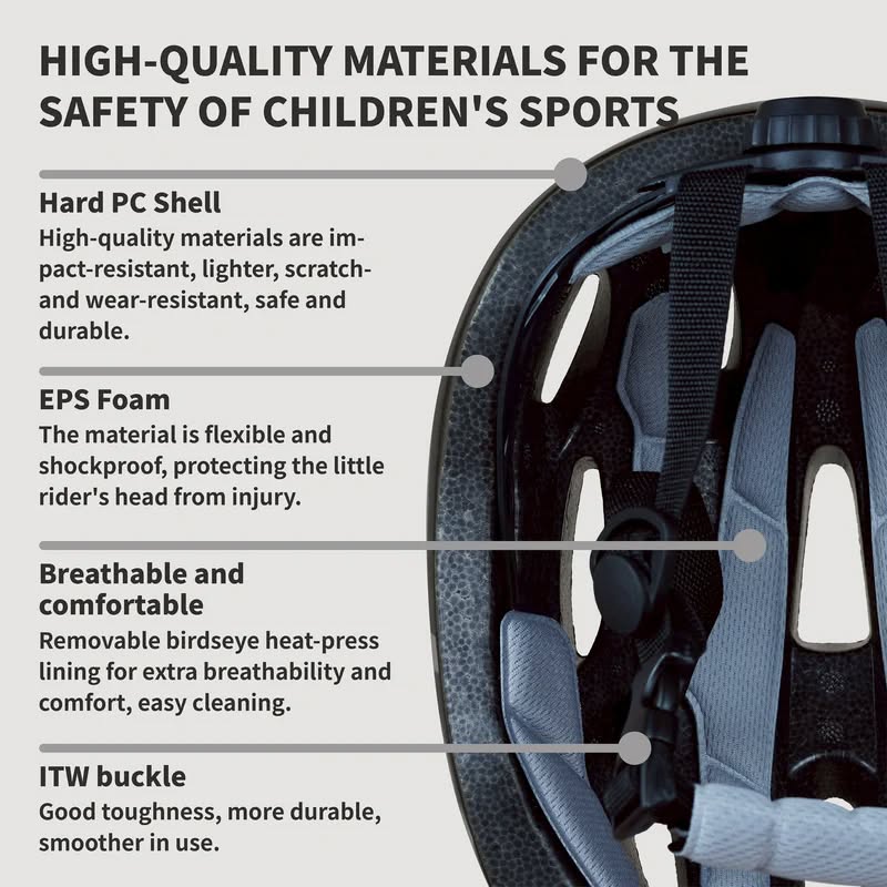 -หมวกกันน็อคสำหรับเด็กที่ปกป้องได้ดีขึ้น เปลือกนอกพีซีมีคุณภาพสูงกว่า ทนต่อแรงกระแทก ทนต่อรอยขีดข่วน ทนต่อการสึกหรอ และมีอายุการใช้งานยาวนานขึ้น และในขณะเดียวกันก็มีน้ำหนักเบากว่า วัสดุ EPS ภายในมีความยืดหยุ่นและทนต่อแรงกระแทกได้ดีกว่า และปกป้องศีรษะของผู้ขับขี่รุ่นเยาว์จากการบาดเจ็บ